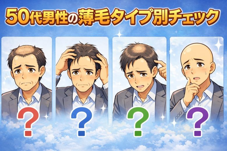 50代の薄毛対策でまず大切なのは、「自分がどのタイプなのか」を正しく知ることです。若い頃は一部分だけ気になっていた薄毛も、50代になると複数のタイプが同時に進行しているケースが少なくありません。