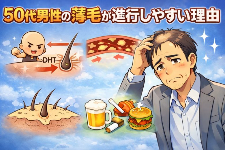 50代になって薄毛が一気に進んだと感じる方は少なくありません。私自身もそうでしたが、その原因は「年齢」だけではなく、体と頭皮の変化に気づかず、若い頃と同じ感覚でケアを続けてしまうことにあります。ここでは、50代男性の薄毛が進行しやすい主な理由を解説します。