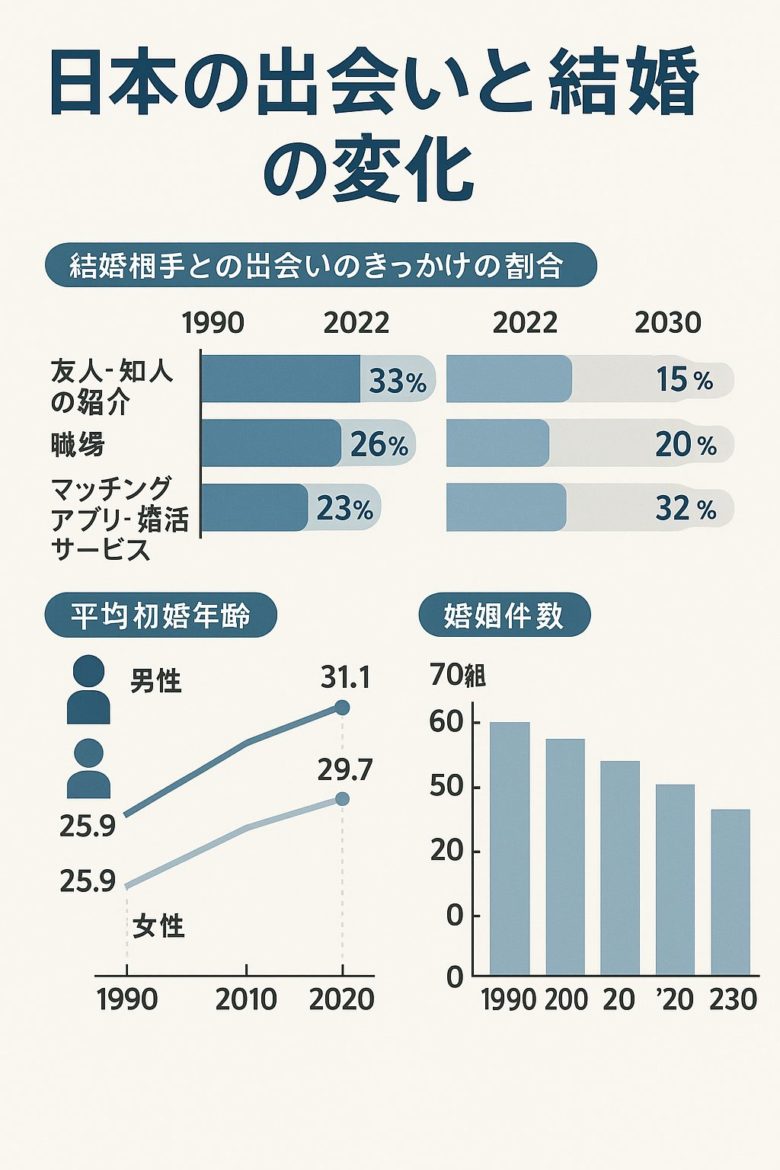 • マッチングアプリ・婚活サービス:急増(2023年の結婚カップルの約1/4がネット経由)。
