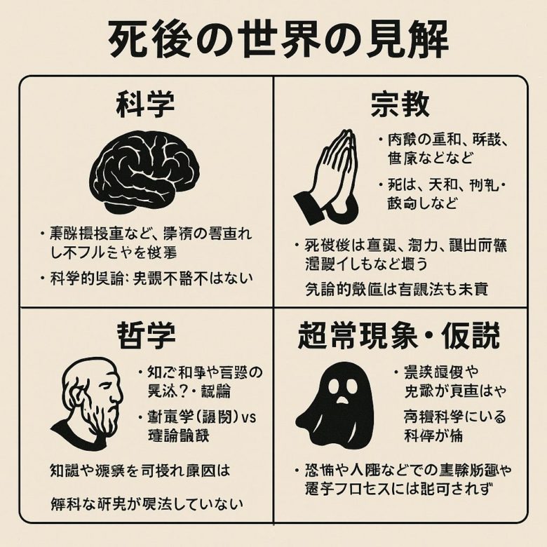 • 心霊現象や霊視体験を死後世界の証拠とする主張はあるが、科学的再現性や検証には至っていない。