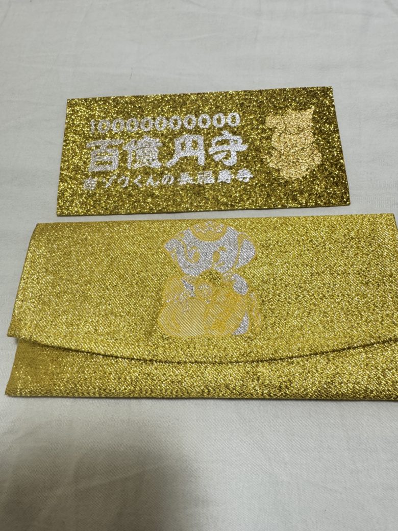 お参りするだけでは効果が薄いかもと感じ人気のお守りも購入してきました。百億円守り(3,000円)と宝くじ入れ(3,000円)の2つで勝負します。これで半年後には、、、